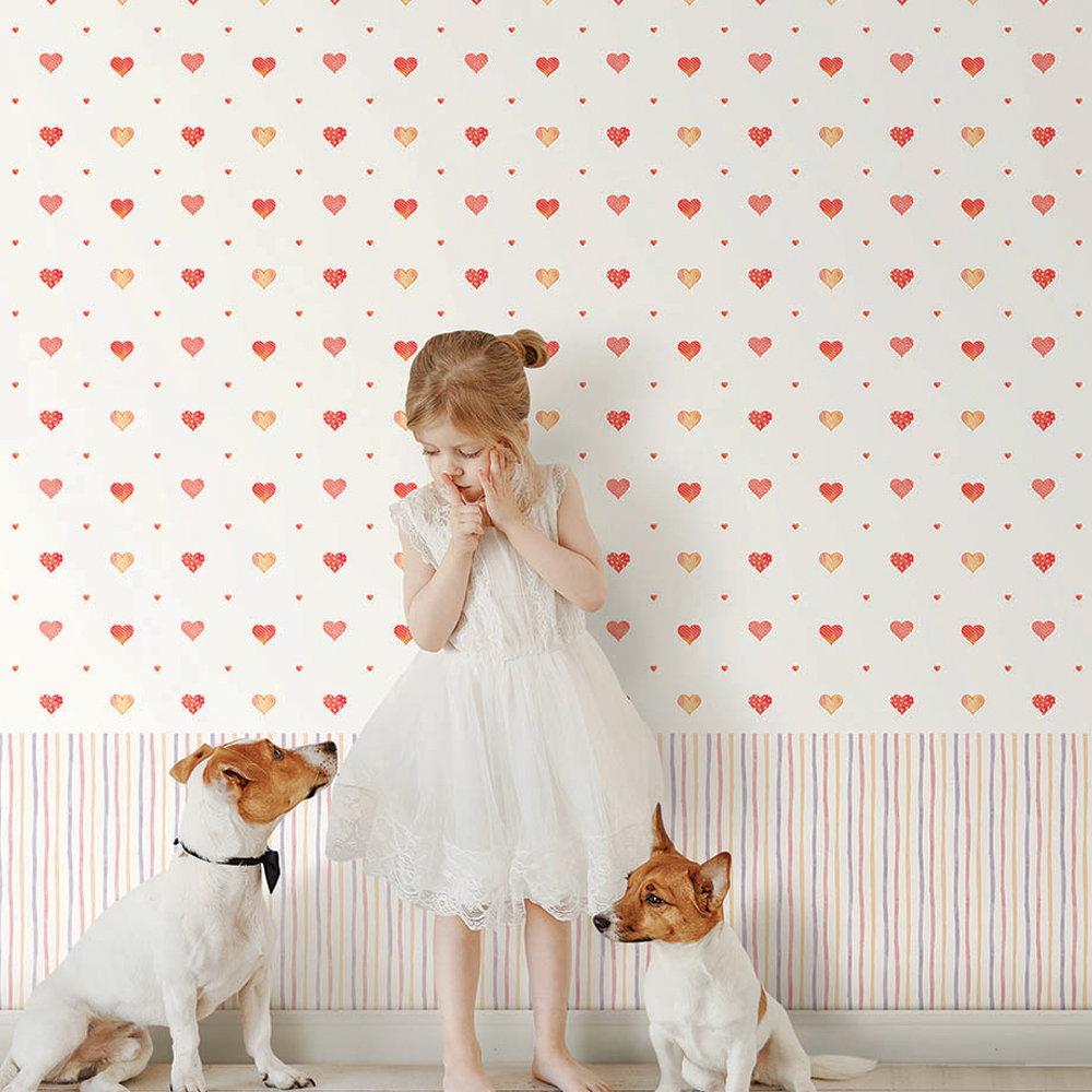Ce papier peint à thème clair est parfait pour la chambre de votre enfant avec un motif en forme de cœur et des couleurs chaudes. Montrez à vos enfants à quel point vous les aimez avec des murs recouverts de cœurs.